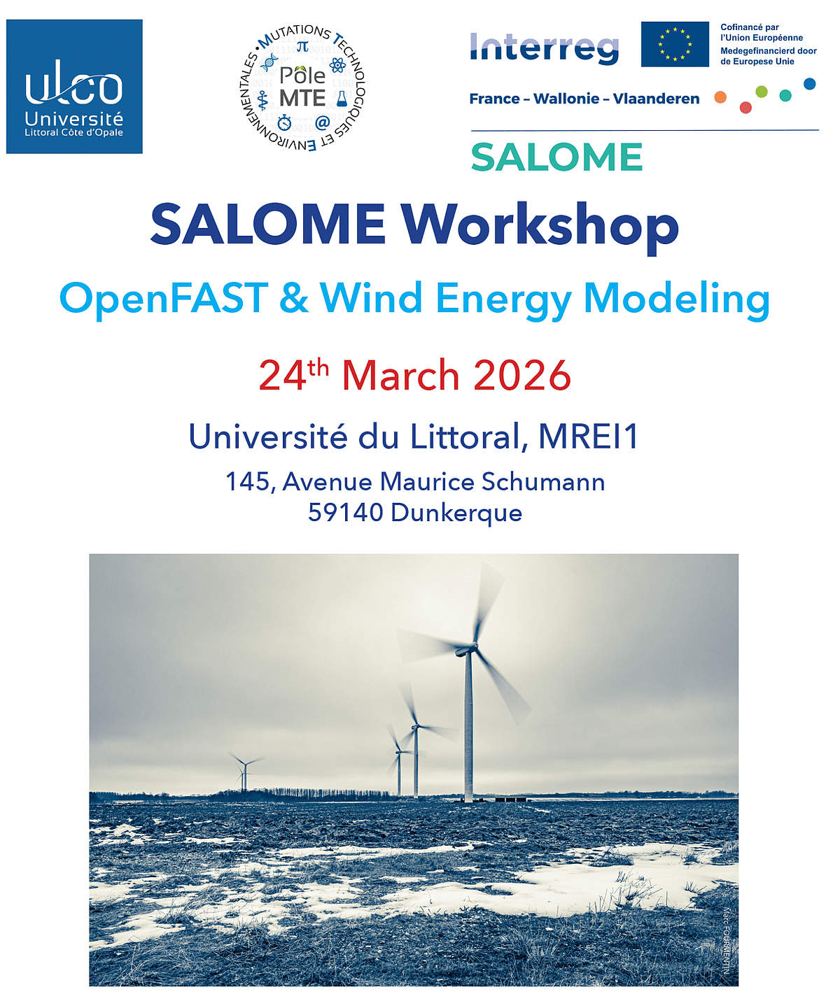 Dans le cadre du programme Interreg France–Wallonie–Vlaanderen et du projet de recherche SALOMÉ, l’Université du Littoral Côte d’Opale (ULCO) a accueilli, le 24 mars 2026, le workshop “OpenFAST & Wind Energy Modeling”. Avec le soutien du Pôle de Recherche MTE, cette journée scientifique a réuni les partenaires français et belge du consortium autour d’un objectif commun : faire progresser la compréhension et la modélisation du comportement des éoliennes, en s’appuyant notamment sur l’outil OpenFAST.