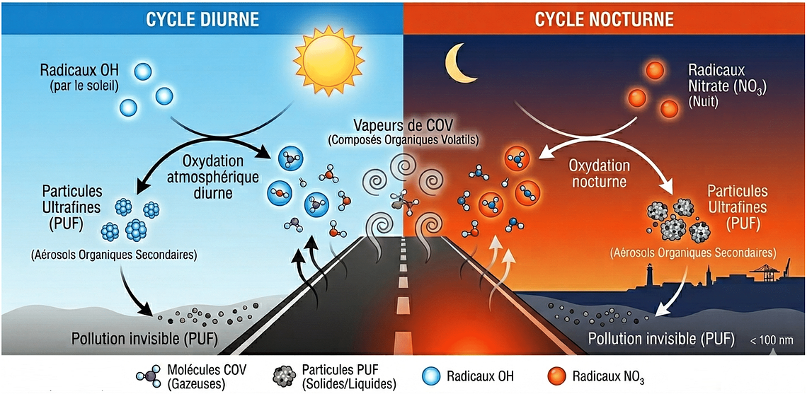Les chercheurs ont découvert que ces COV, lorsqu'ils rencontrent certains "nettoyeurs" de l'atmosphère (les radicaux OH le jour et NO₃ la nuit), se transforment en particules ultrafines. Ces particules, aussi appelées Aérosols Organiques Secondaires (AOS) sont si petites qu'elles peuvent pénétrer profondément dans nos poumons et nuire à la qualité de l’air.