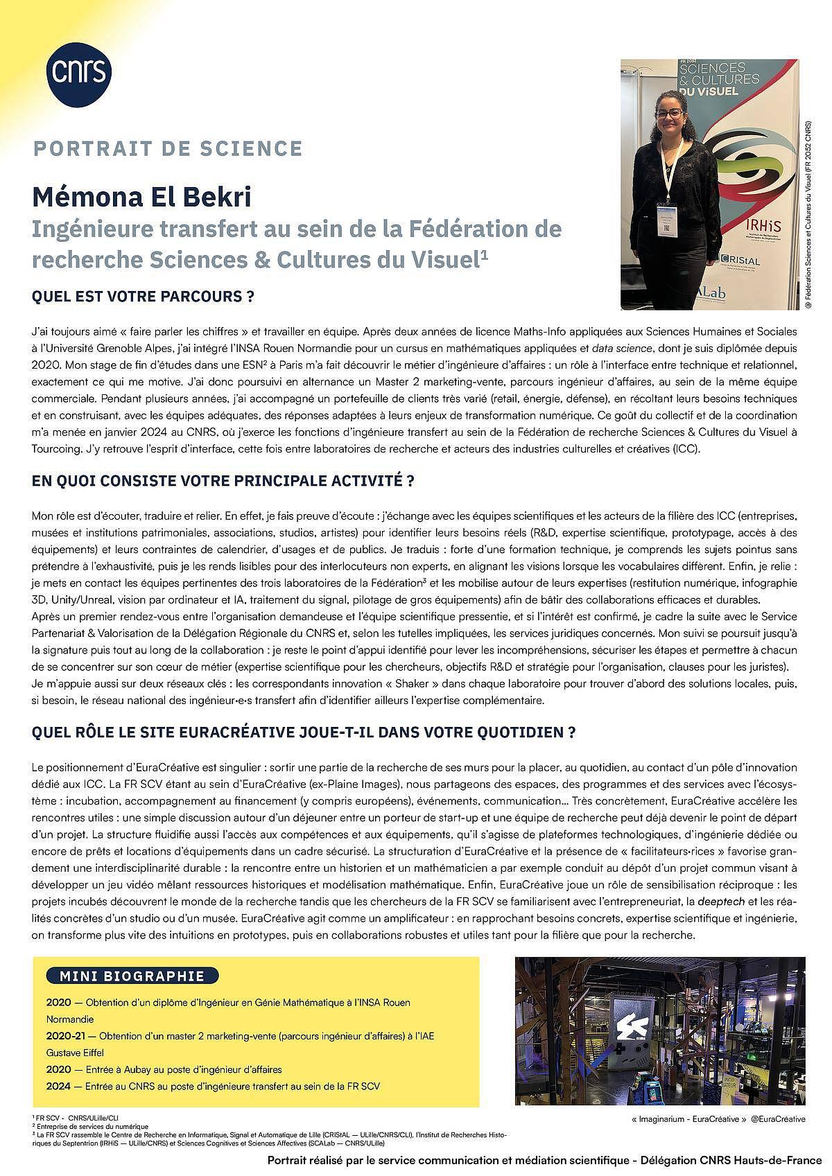 Lire le portrait de sciences de Mémona EL BEKRI,  ingénieure transfert au sein de la Fédération de recherche Sciences et Cultures du Visuel (SCV - CNRS/ULille/CLI)