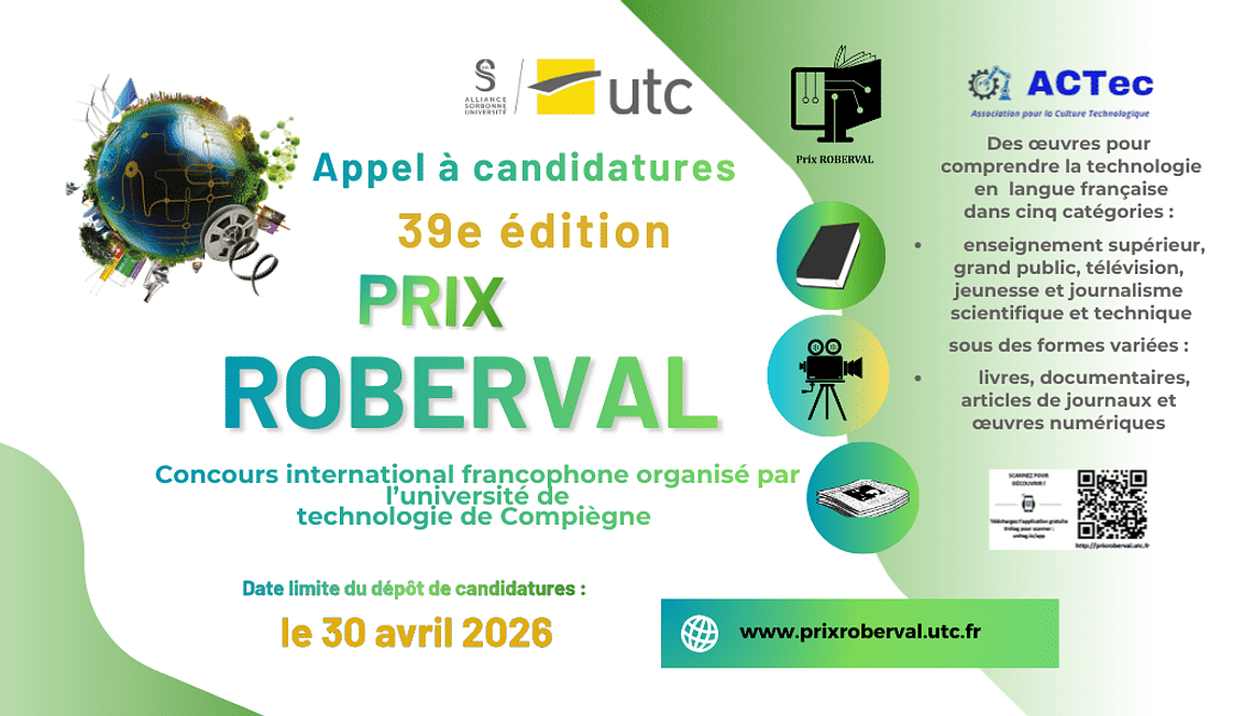 Le Prix Roberval, concours international organisé par le pôle des Cultures Scientifique, Technique et Industrielle (CSTI) de l’Université de Technologie de Compiègne (UTC), a pour but de soutenir la production et la diffusion d’ œuvres consacrées à l’explication de la technologie en langue française.
