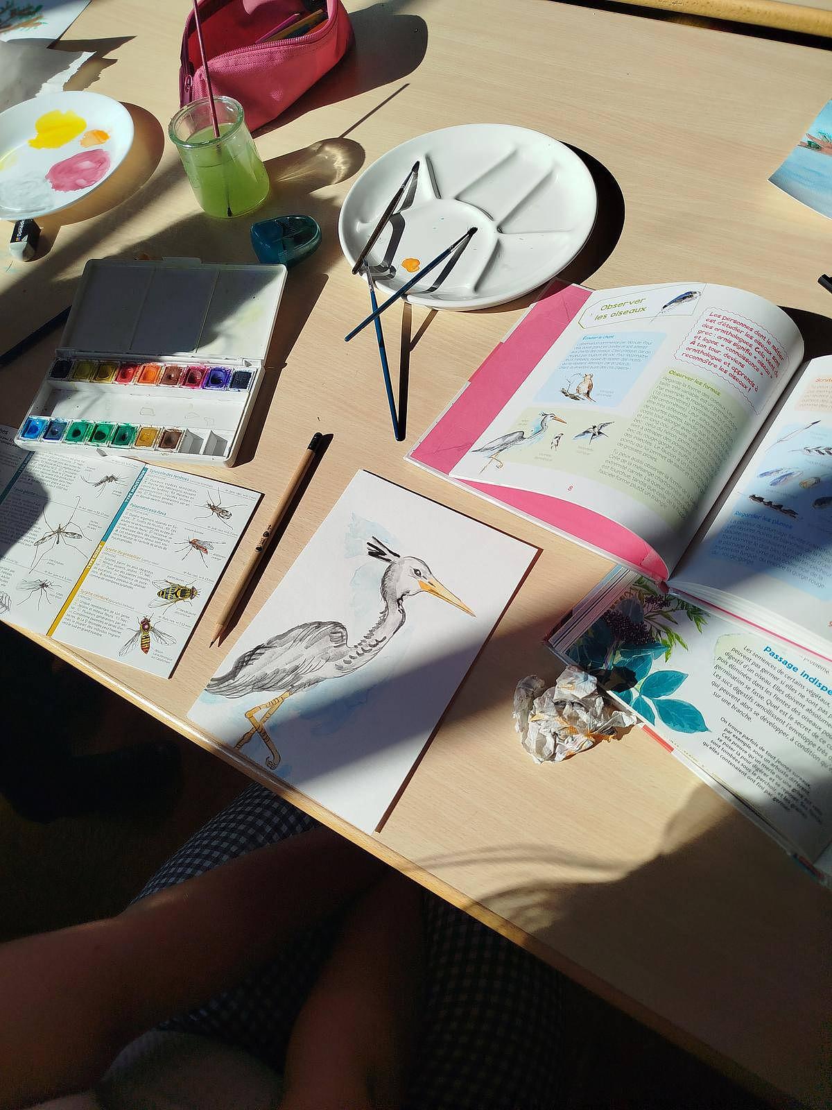 Pour la seconde séance, j'ai sorti des pinceaux et de l'aquarelle, puis nous nous sommes entraînés à gérer l'eau sur le pinceau, les mélanges et la finesse du trait. Une fois la maitrise acquise, ils ont réalisé une illustration de leur choix, ici un héron cendré