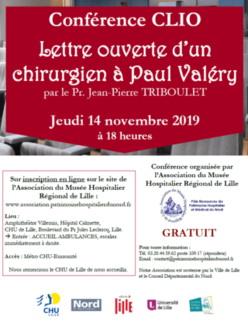 Dans le cadre des conférences CLIO proposées par l’Association du Musée Hospitalier Régional de Lille, une conférence "Lettre ouverte d’un chirurgien à Paul Valéry" animée par le Pr. Jean-Pierre TRIBOULET vous est proposée le jeudi 14 novembre 2019 à 18h.