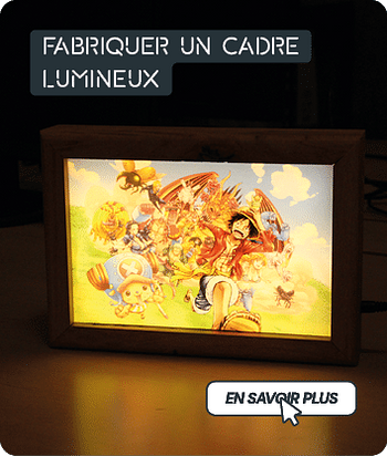 Réaliser un cadre lumineux personnalisé. Son principe est original : éteint, il révèle une forme précise ; allumé, l’arrière-plan s’illumine, offrant un effet visuel unique. Chaque participant repart avec un objet créatif, fonctionnel et unique.