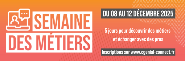 Chers professeurs, acteurs et actrices de l’orientation, Les inscriptions aux webinaires de la Semaine des métiers du 8 au 12 décembre 2025 sont toujours ouvertes ! Rencontres avec des professionnels du numérique, échanges sur les défis écologiques de l'industrie, découvertes du secteur de l'aéronautique... retrouvez le programme de cette semaine et inscrivez vos classes dès à présent aux sessions de votre choix via la plateforme CGénial Connect Les webinaires durent entre 1h et 1h30. Imaginez votre semaine à la carte, selon vos besoins, en vous inscrivant à une ou plusieurs d'entre elles ! Ces visioconférences sont gratuites, accessibles aux acteurs de l’éducation accompagnés de leur classe, quelle que soit sa localisation géographique (France hexagonale, collectivités et départements d'outre-mer, établissements français à l'étranger…). Elles s’adressent plus particulièrement aux élèves de la 4ème à la terminale. Les heures indiquées correspondent au fuseau horaire de Paris. Pour toute question, n’hésitez pas à nous contacter à l’adresse d.riviere@cgenial.org. Au plaisir de vous retrouver à la Semaine des métiers, |